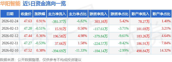 证券之星动静,截至2026年2月24日收盘,华阳智能(301502)报收于47。63元,换手率4。97%,成交量1。17万手,2月24日的资金流向数据方面,从力资金净流出381。37万元,占总成交额6。82%,逛资资金净流入303。1万元,占总成交额5。42%,散户资金净流入78。27万元,占总成交额1。4%。