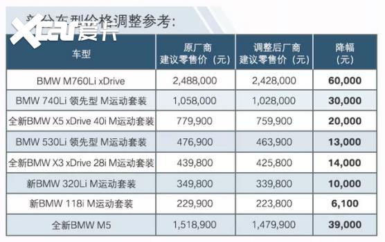 仅隔一天,宝马也正在其微信上颁布发表,从3月16日其下调BMW全系产物厂商零售价,此中还包罗正在华出产的BMW 3系,5系等车型,此中降价最高的BMW M760Li xDrive降幅达到了6万元,而旗下的入门款车型宝马1系也有着6000元摆布的降价,单从降幅来看,力确实不小。