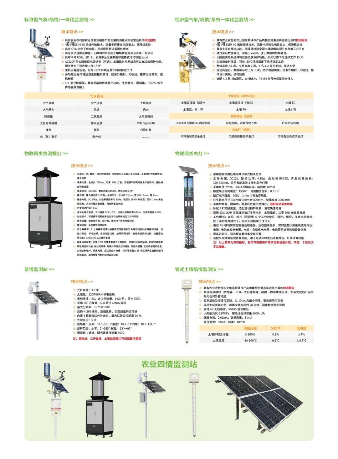 自从研发:农业四情监测坐,景象形象坐,墒情坐,管式墒情仪,虫情测报灯,杀虫灯,温室监测宝,养殖监测宝,从动化节制柜,农业大数据办理平台。